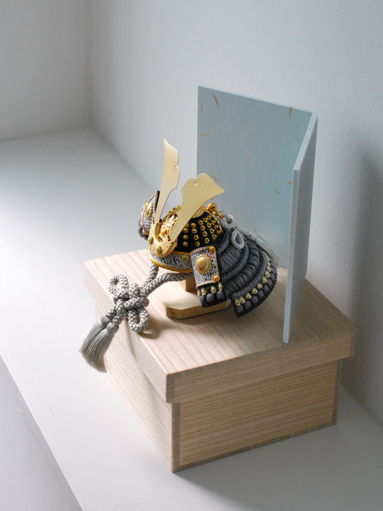 ※作札付きます。複雑な組み立てがなく、小さな机やサイドボードなどにお飾りできるおしゃれな兜飾りです。兜(かぶと)本体と飾ったり収納したりする黒い櫃(ひつ)が付いたコンパクトさが人気の作品です。作者は内
