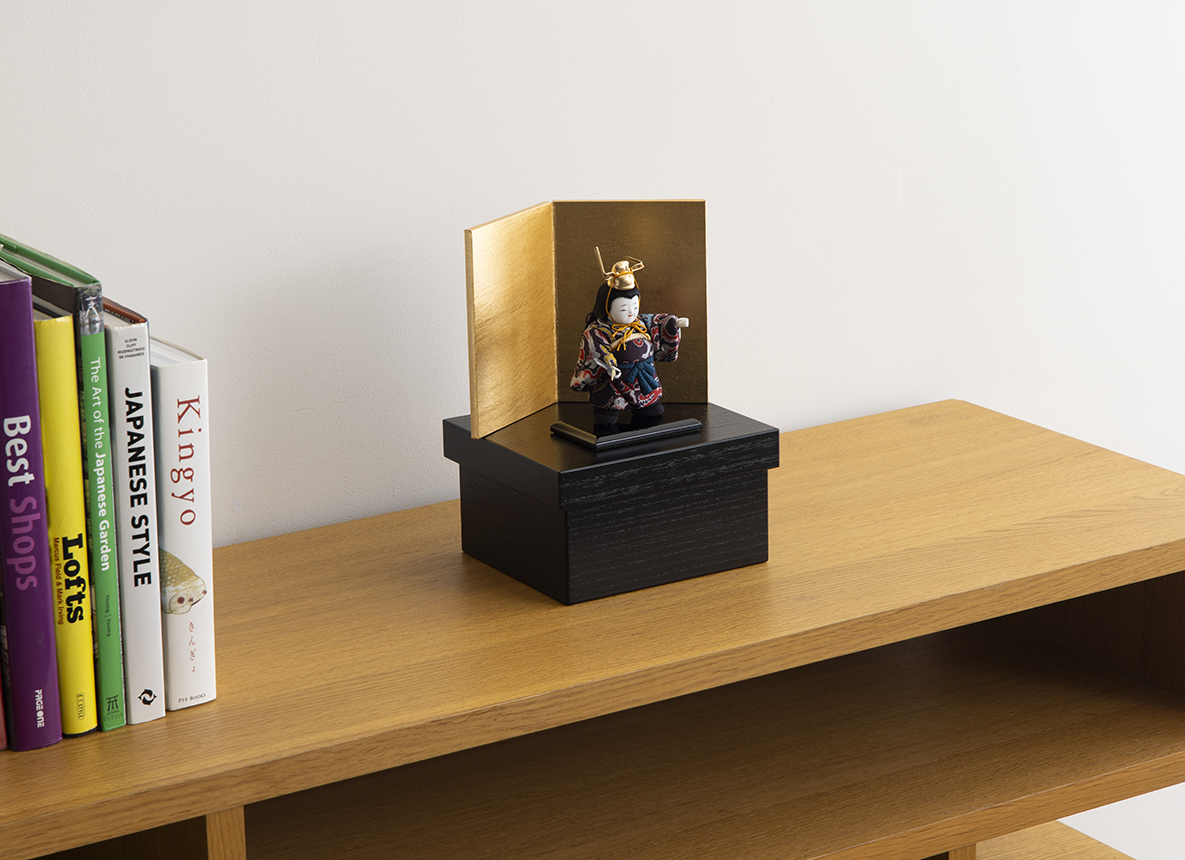 手のひらサイズの小さくかわいらしい五月人形です。鍾馗とは五月人形の代表として現在もなお、人々の人気を集めております。奈良時代に日本へ伝わった端午の節句の風習と共に、日本にもたらされた魔除けの神様を言います。唐の玄宗皇帝が病気にかかったとき、恐ろしい形相の大男が悪鬼を退治する夢を見ました。夢から覚めた皇帝は、すっかり病気が治っていたことから、これを画家・呉道子に描かせたことが鍾馗の始まりとされています。ほとんどがいかめしいお顔で描かれることが多いお顔ですが、五色・原孝洲では、品よく滋味に溢れた表情でお作りしております。ツヤを含んだ美しい西陣織には、唐草と龍を意匠化したお衣装が織り込まれております。本棚にもそっと飾れるコンパクトなサイズ感は、一年中お飾りすることもできると好評です。黒い箱に金屏風のステージでお飾りしますが、そのまま収納する木箱となっているため、大変手軽で毎年お飾りするのが楽しみになります。