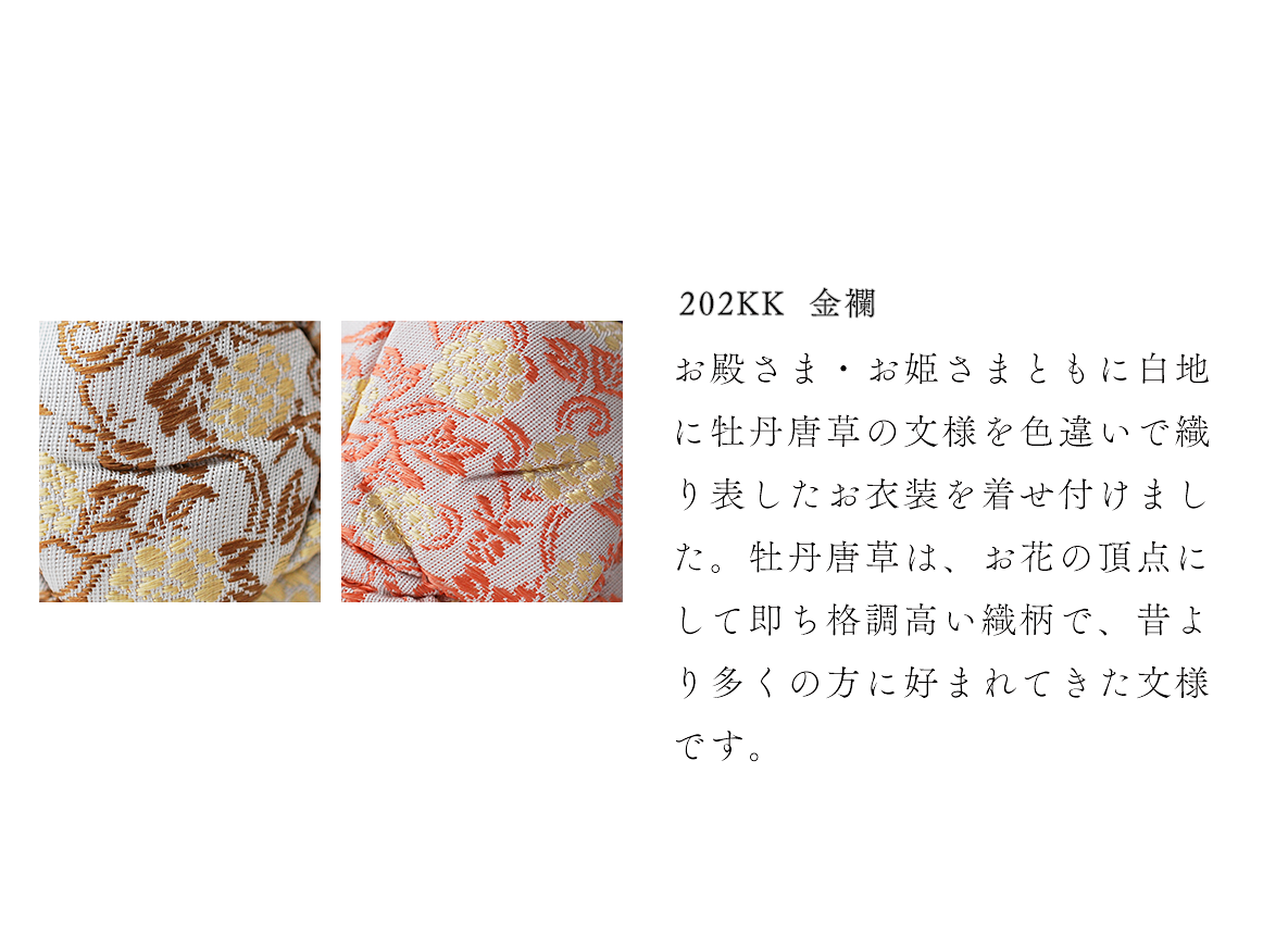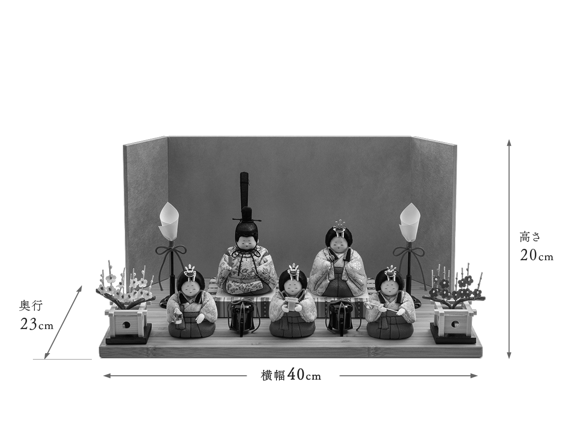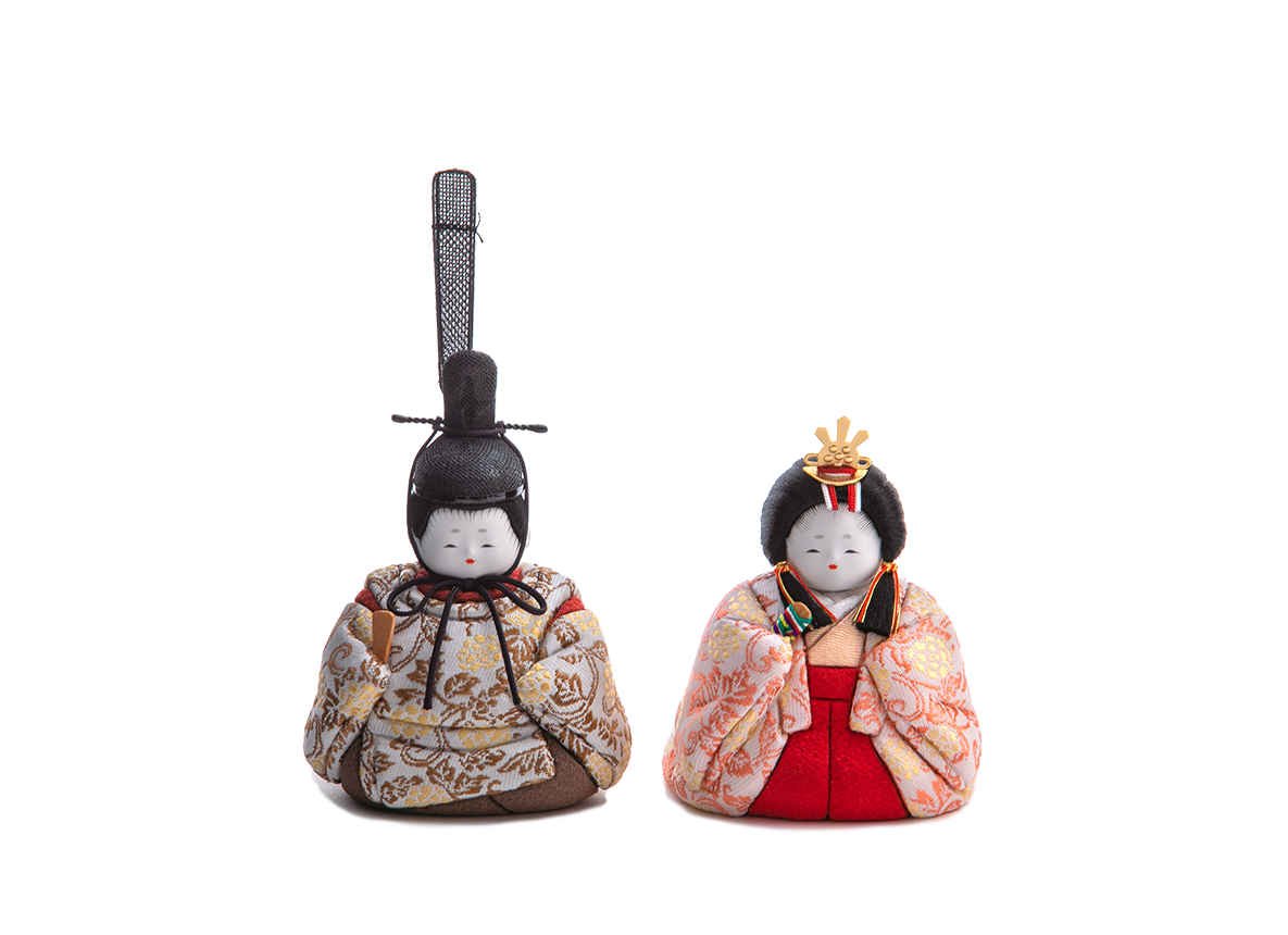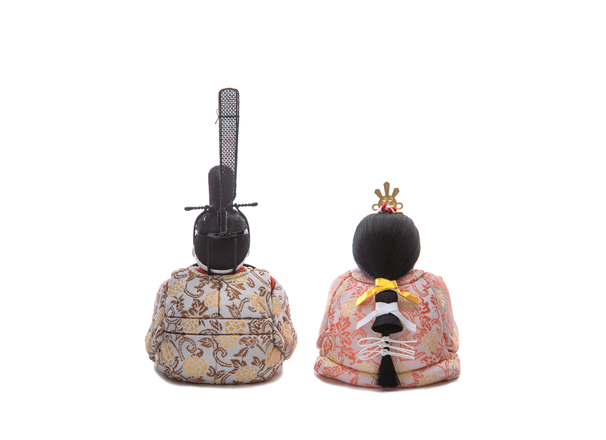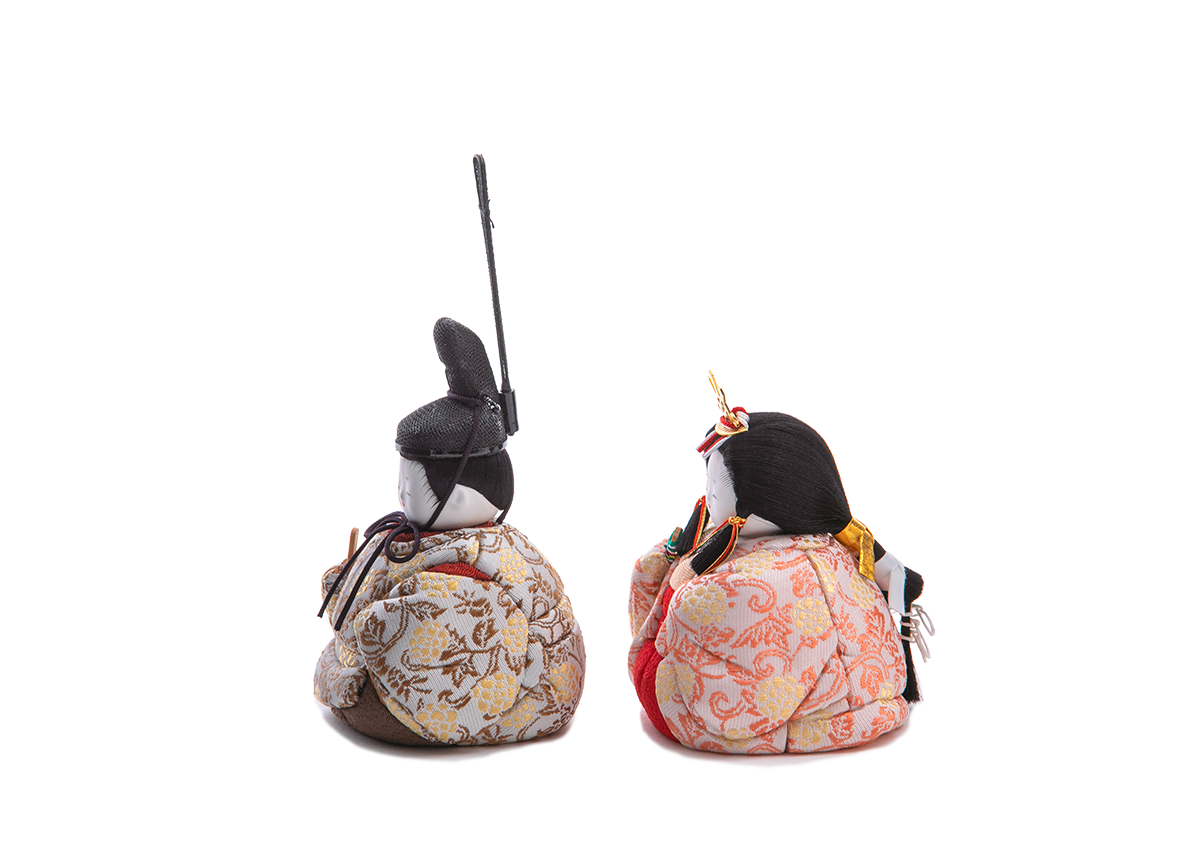 飾り台やお屏風が選べる、コンパクトで飾りやすいHINAシリーズの雛人形です。おだやかな表情、生まれたばかりの赤ちゃんをイメージさせる小さくて丸々としたフォルムは、木目込み人形ならではの雛人形です。小ぶりでも確かなお作りは各部分に表れています。ふんわりと空気を包みこみ、なめならかな髪型が特徴です。お衣装はたて糸とよこ糸を組み合わせて細かな柄を織り表す金襴地です。白地に牡丹唐草という、お花の頂点にして格調高い織柄で、昔より多くの方に好まれてきた文様を着せ付けました。上品で落ち着いた伝統的なお衣装と愛くるしいお姿とのバランスが絶妙なお雛様です。殿姫同様に、お子様の行く末頼もしい成長をお守りする三人官女は、雛人形の華やかでいながら厳かな味わいを豊かにします。かわいいだけでは終わらない、伝えるべき大切な日本文化の美しさをこの場へ現出させてくれます。雛人形として欠かすことのできない三人官女も私たちのこだわりです。組み立て不要の平らな飾り台に、シンプルなデザインの屏風をのせてお飾りする、上品でおしゃれな雛人形です。