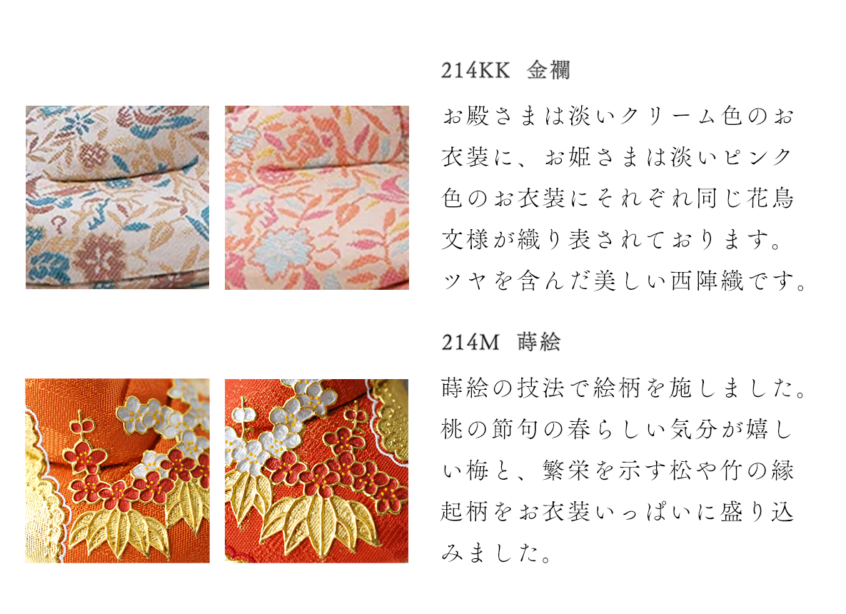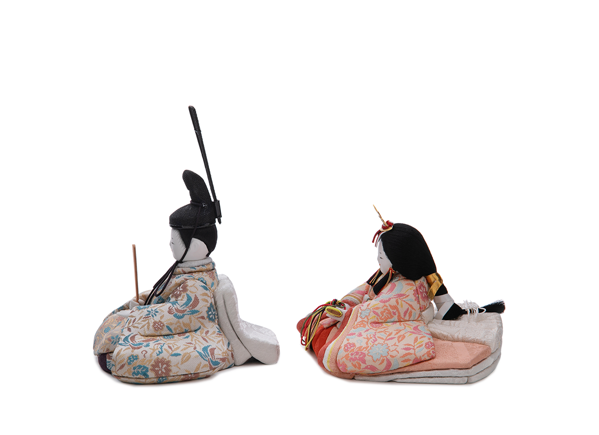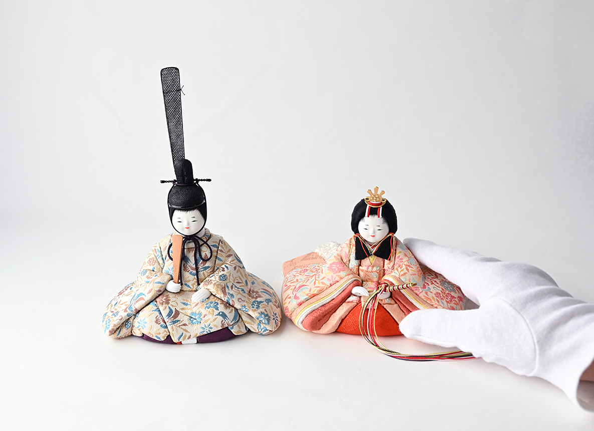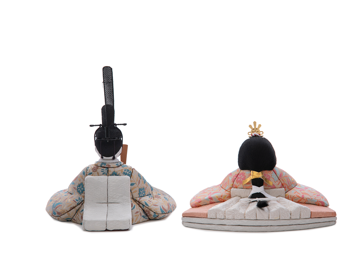 【金襴】飾り台やお屏風が選べる、コンパクトで飾りやすいHINAシリーズの雛人形です。お衣装の美しさや体の流れるような造形の美しさに見惚れてしまう五色・原孝洲の自信作で、三代続く木目込み人形作家の技術に裏打ちされた雛人形です。まず、体の造形の繊細さに魅力がつまっています。肩口から袂(たもと)、背中にかけて美しい曲線を描いており、写実味を得ながらも、それでいてどこかにお人形さんらしい丸みを帯び、絶妙なバランスが愛くるしさを生んでいます。お姫様の十二単を着重ねた際の、袖口と後背部の美しいグラデーションも見逃せません。同様にお殿様も後背部に下襲の裾(したがさねのきょ)と呼ばれる部分まで再現し伝統に則りながら、かつ、足を組んだ形などはかわいらしく、味わい深い作品になりました。お顔も体とのバランスに合わせ、上品で麗しい、しかしどこかに幼さを残した、五色・原孝洲独特であり、大切にしているお姿です。ふんわりと空気をまとったように贅沢に結われた髪型は、多くの絹糸を丁寧にまとめあげて仕上げており、額の生え際まで筆で丁寧に描きこむことで、特徴あるお顔がもつ優美さを引き立てます。お衣装はツヤを含んだ美しい西陣織で、貴人にふさわしい花鳥文様を殿姫へ仲睦まじく着せつけました。殿姫同様に、お子様の行く末頼もしい成長を見守る三人官女は、雛人形の華やかでいながら厳かな味わいを豊かにします。かわいいだけでは終わらない、伝えるべき大切な日本文化の美しさをこの場へ現出させてくれます。雛人形として欠かすことのできない三人官女も私たちのこだわりです。収納にも困らないと好評の、組み立て不要の軽くて薄い平らな台に屏風をのせてお飾りするセットです。まさにハレの日にふさわしい雛人形です。【蒔絵】こちらの作品は特にお衣装の出来栄えに目を惹かれます。豪華にも本金箔を使い、蒔絵の技法(手描きで衣装の上から直接描く)で絵柄を施しました。桃の節句の春らしい気分が嬉しい梅と、繁栄を示す松や竹の縁起柄をお衣装いっぱいに盛り込みました。お子様の門出に良い縁起をたくさん取り込んだ絵柄となっています。ご家族で集うお節句のお祝いにはきっとお雛様に注目が集まるはずです。