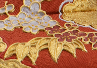 たて糸とよこ糸を組み合わせてつくる織物の一つ。色糸だけでなく、金糸あるいは平金箔をつかって織られた織物です。