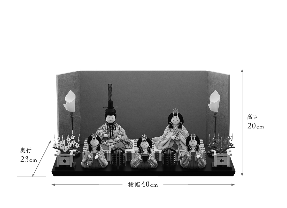 お人形やお道具などゆったりとお飾りいただける飾り台幅45cmの「竹」にご変更可能です。詳細はこちら⇒Topics「萌雛五人飾りの飾り台_竹につきまして」