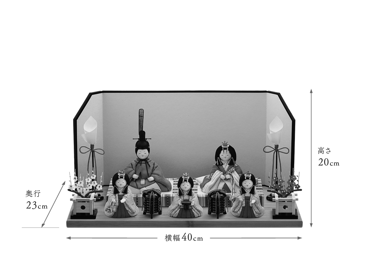 お人形やお道具などゆったりとお飾りいただける飾り台幅45cmの「竹」にご変更可能です。詳細はこちら⇒Topics「萌雛五人飾りの飾り台_竹につきまして」
