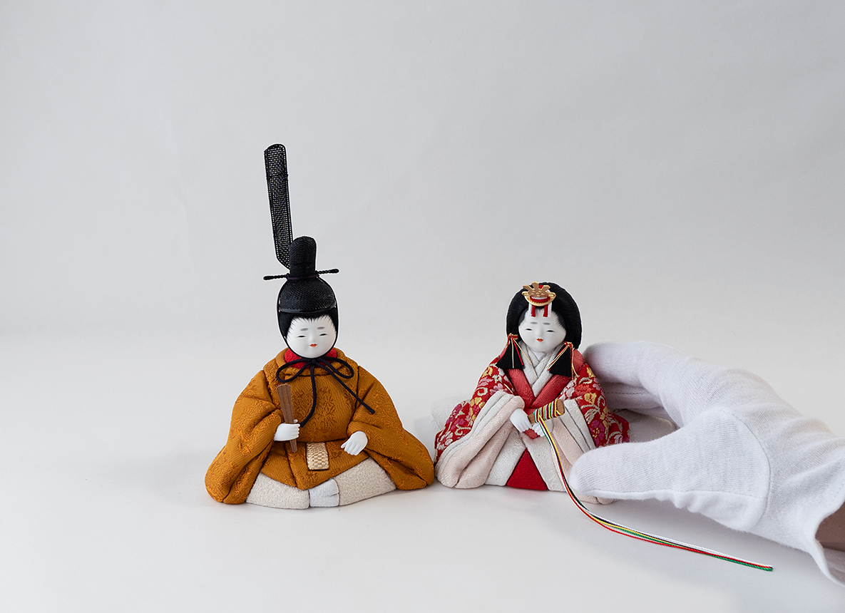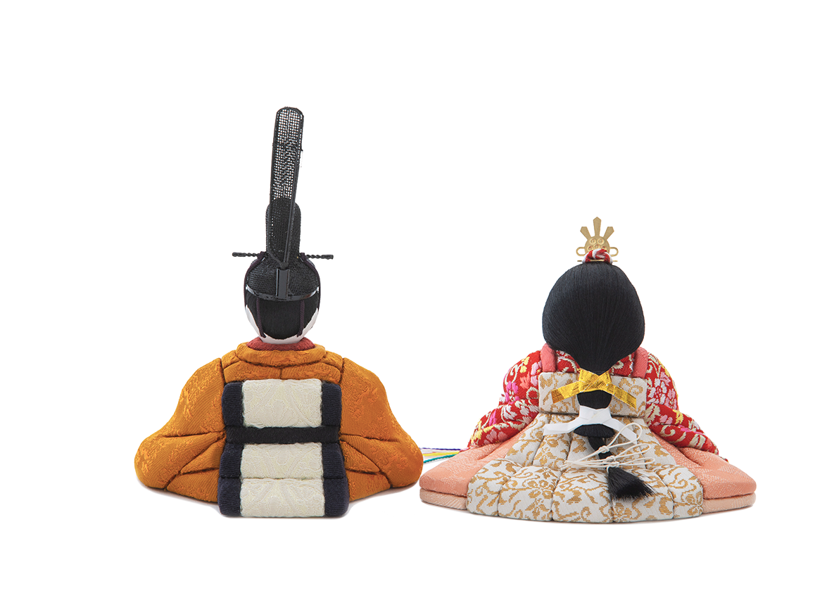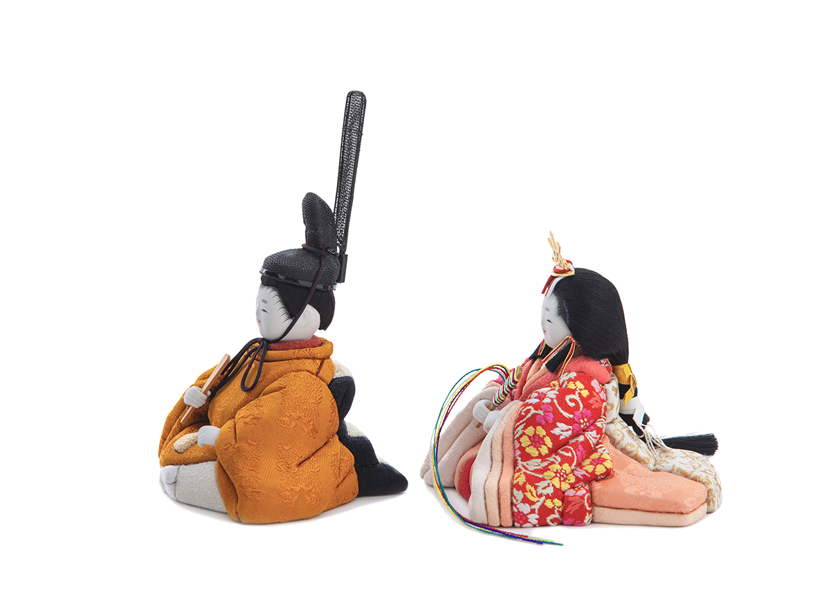 飾り台やお屏風が選べる、コンパクトシリーズです。ほほえみをたたえた表情は赤ちゃんのもつ純真無垢な姿、また成長した上品な雰囲気をもただよわせており、これこそが五色・原孝洲の大切にする雛人形です。ふんわりと空気をまとったように贅沢に結われた髪型は、多くの絹糸を丁寧にまとめあげて仕上げており、額の生え際まで筆で丁寧に描きこむことで、特徴あるお顔がもつ優美さを引き立てます。お殿様の後背部には下襲の裾(したがさねのきょ)と呼ばれる部分まで再現しており、着物を召したお姿は、木目込み人形としての高い技術を示しています。金襴のお衣装は3種類のご用意。