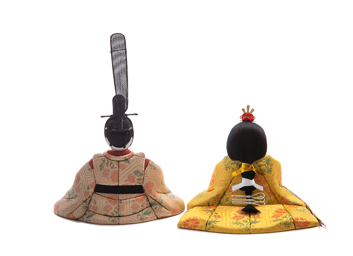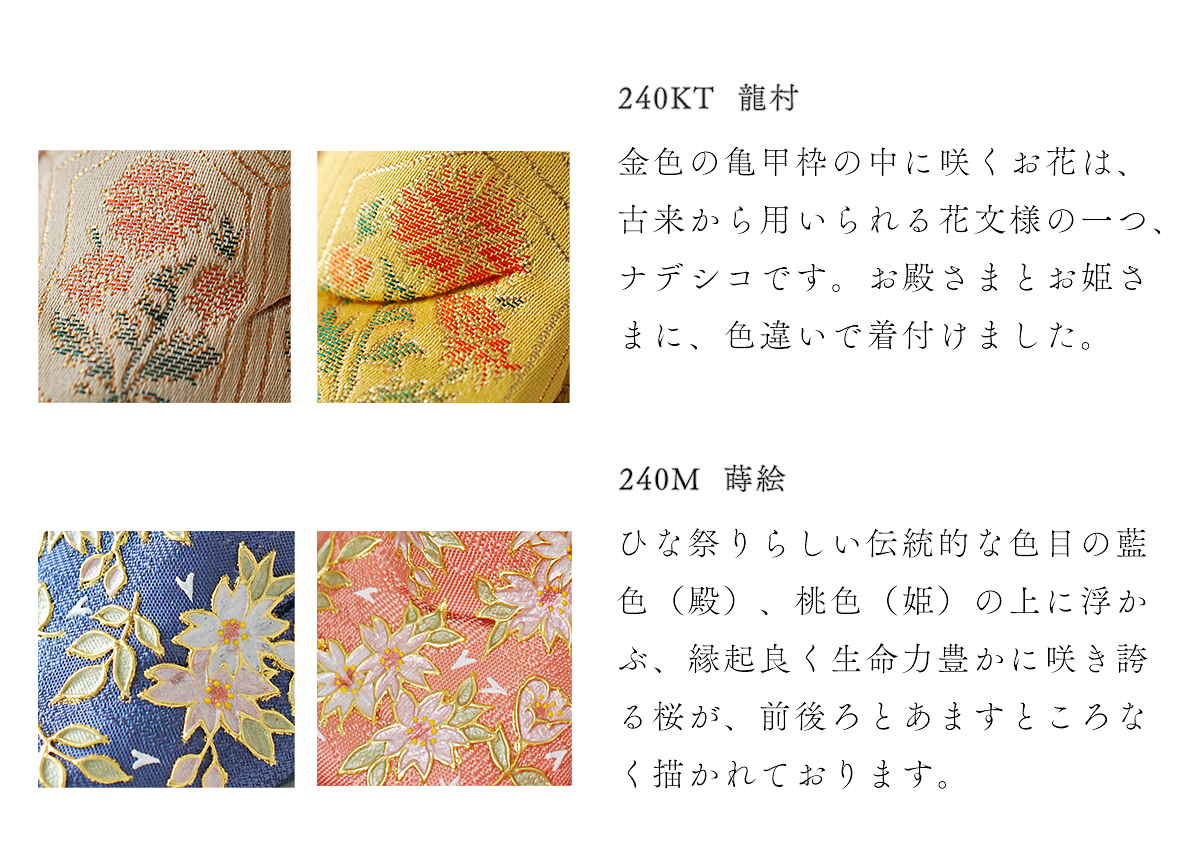 【龍村】 飾り台やお屏風が選べる、コンパクトで飾りやすいHINAシリーズの雛人形です。赤ちゃんのように幼いというよりは、成長された上品なお姿で、ほほえみかけてくれているような表情にほっこりと癒やされる、愛くるしい雛人形です。こだわりぬいたお人形さんの見どころはお衣装です。高級織物・龍村裂を着せており、ツヤを含んだ上質な生地に、高位の方々が愛した、風流なナデシコのお花が可憐に浮かび上がります。体の造形は、お殿様お姫様ともに袂(たもと)の流麗さ、足を組んだ形に至るまでフォルムの端正さが、お顔とお衣装の魅力を引き立てます。空気をまとったように贅沢に結われた髪型は、多くの絹糸を丁寧にまとめあげて仕上げております。お顔、造形、お衣装、髪など木目込み人形の命とも言える要素が渾然一体となって表された至極の作品です。殿姫同様に、お子様の行く末頼もしい成長を見守る三人官女は、雛人形の華やかでいながら厳かな味わいを豊かにします。かわいいだけでは終わらない、伝えるべき大切な日本文化の美しさをこの場へ現出させてくれます。雛人形として欠かすことのできない三人官女も私たちのこだわりです。コンパクトの平らな飾り台に、すっきりとしたお屏風で飾るセットです。永くお飾りするお雛様。訪れる桃の節句が毎年楽しみになるような雛人形です。 【蒔絵】五色・原孝洲といえば蒔絵のお衣装。より一段と手をかけた豪華な蒔絵のお衣装は、贅沢にも本金箔を使い蒔絵の技法(手描きで衣装の上から直接描く)で絵柄を施しました。ひな祭りらしい伝統的な色目の藍色(殿)、桃色(姫)の上に浮かぶ、縁起良く生命力豊かに咲き誇る桜が、前後ろとあますところなく描かれております。少量生産の人気作品であり、お子様にとって一生のお守りになる特別な作品です。