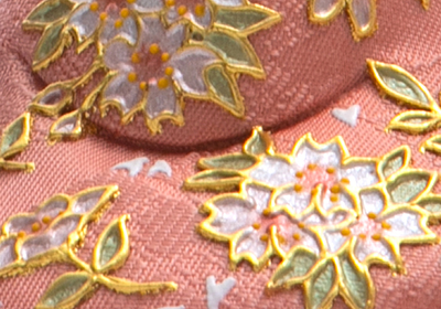 上品なちりめんなどのお衣裳を木目込み後、多彩な色と本金箔で描く蒔絵。盛り上げた絵柄の縁に金箔を貼るほか、多彩な色を重ねて絵柄を描くため、厚みがある豪華な印象で、繊細な模様が可能です。