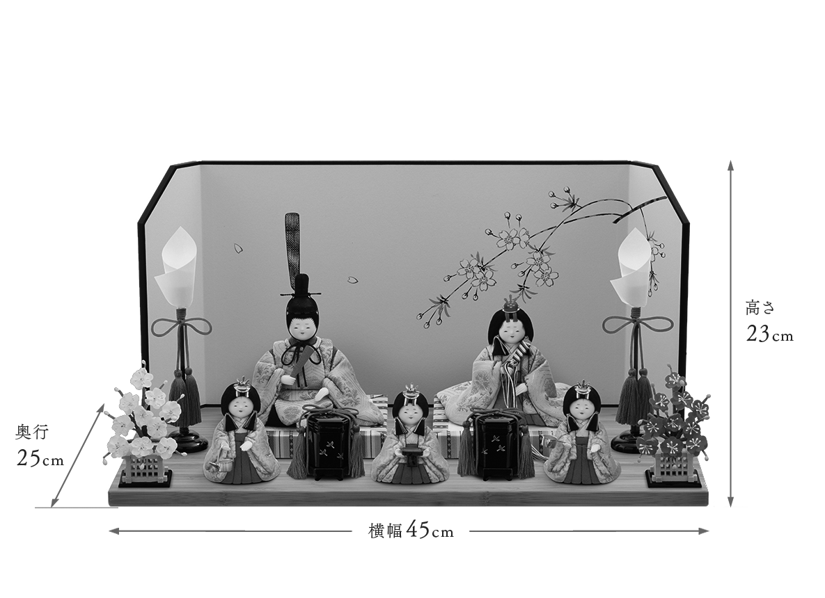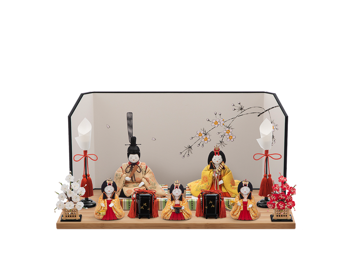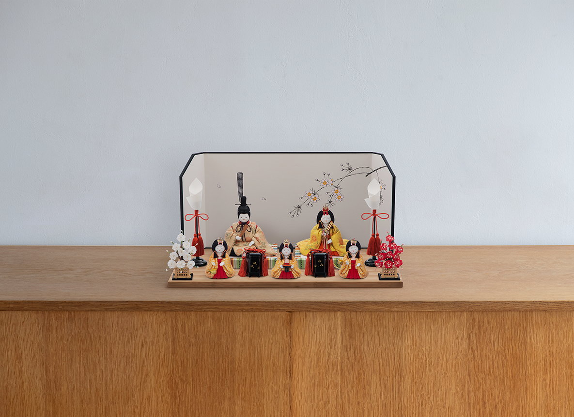 飾り台やお屏風が選べる、コンパクトで飾りやすいHINAシリーズの雛人形です。赤ちゃんのように幼いというよりは、成長された上品なお姿で、ほほえみかけてくれているような表情にほっこりと癒やされる、愛くるしい雛人形です。こだわりぬいたお人形さんの見どころはお衣装です。高級織物・龍村裂を着せており、ツヤを含んだ上質な生地に、高位の方々が愛した、風流なナデシコのお花が可憐に浮かび上がります。体の造形は、お殿様お姫様ともに袂(たもと)の流麗さ、足を組んだ形に至るまでフォルムの端正さが、お顔とお衣装の魅力を引き立てます。空気をまとったように贅沢に結われた髪型は、多くの絹糸を丁寧にまとめあげて仕上げております。お顔、造形、お衣装、髪など木目込み人形の命とも言える要素が渾然一体となって表された至極の作品です。殿姫同様に、お子様の行く末頼もしい成長を見守る三人官女は、雛人形の華やかでいながら厳かな味わいを豊かにします。かわいいだけでは終わらない、伝えるべき大切な日本文化の美しさをこの場へ現出させてくれます。雛人形として欠かすことのできない三人官女も私たちのこだわりです。コンパクトの平らな飾り台に、すっきりとしたお屏風で飾るセットです。永くお飾りするお雛様。訪れる桃の節句が毎年楽しみになるような雛人形です。