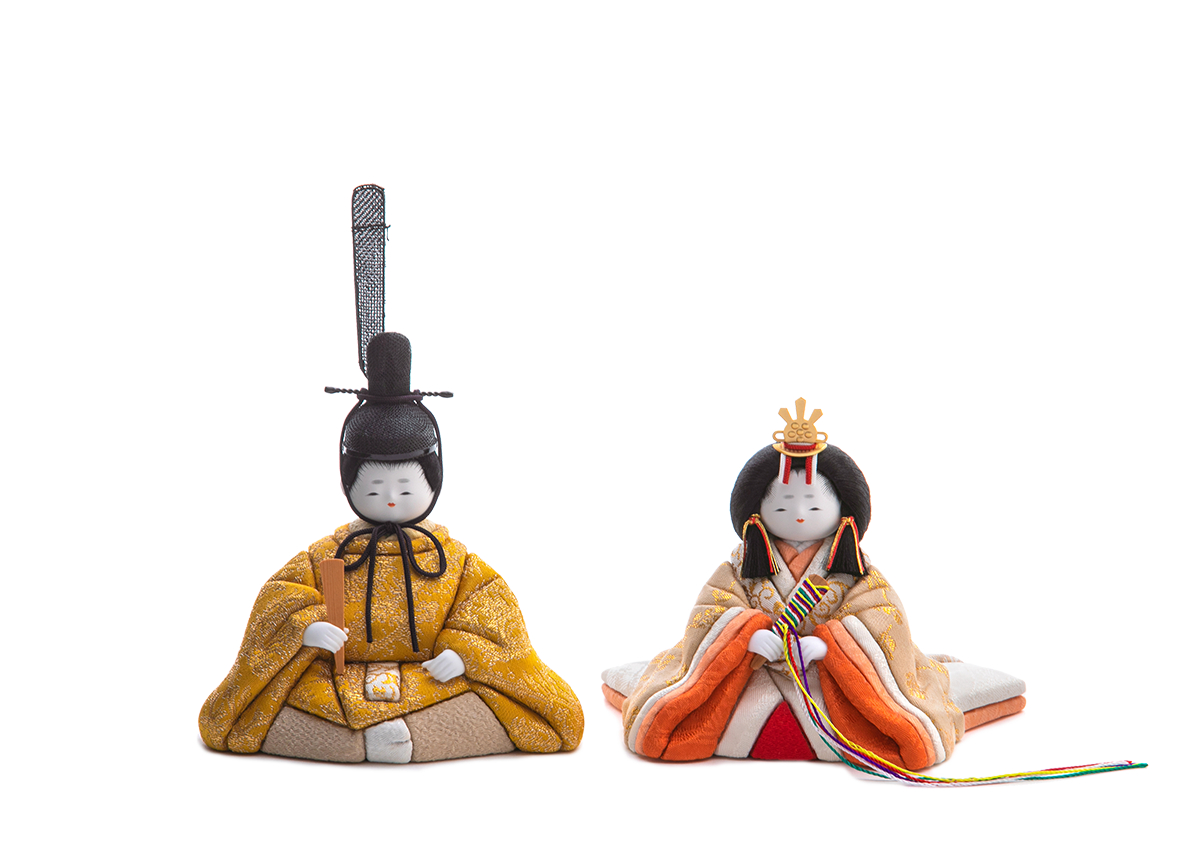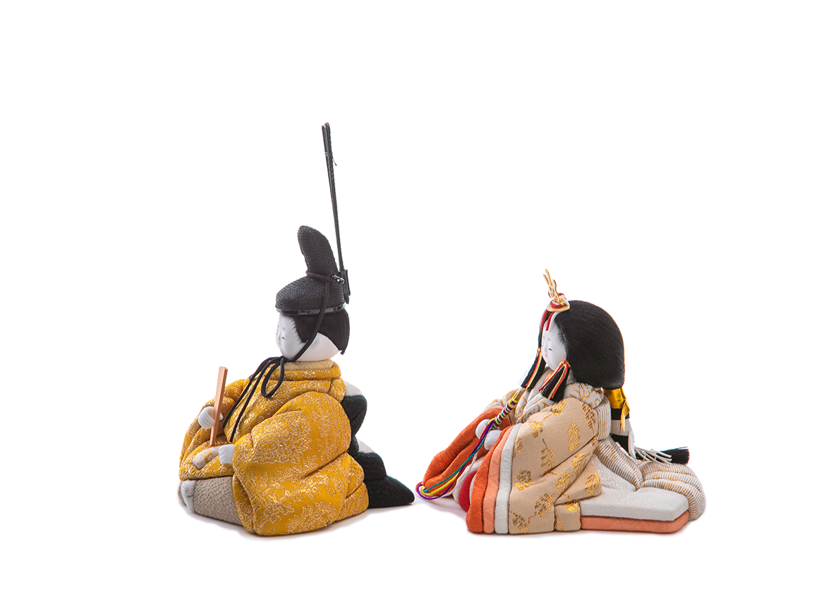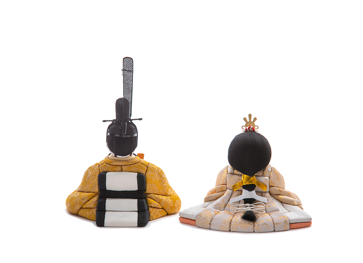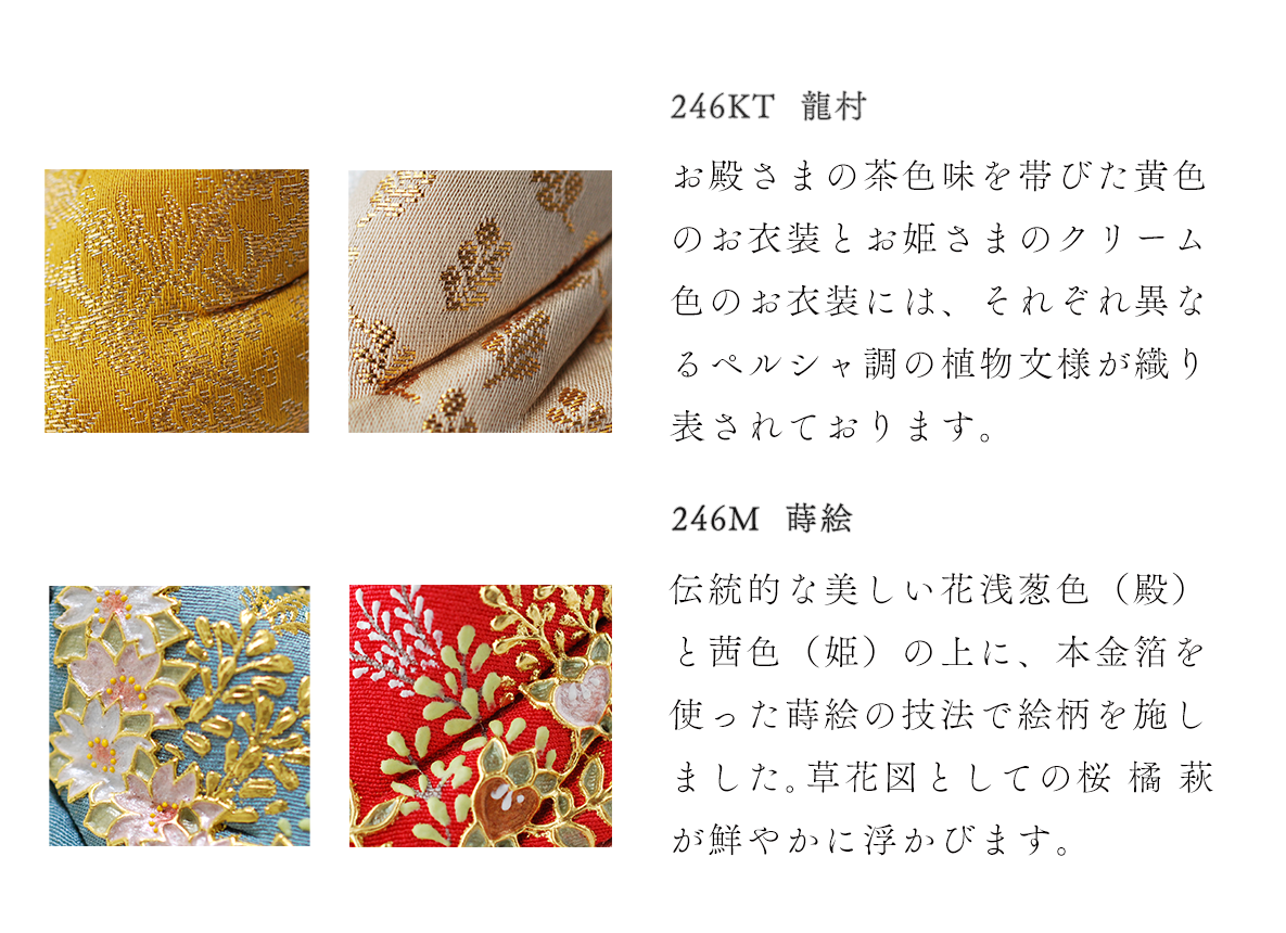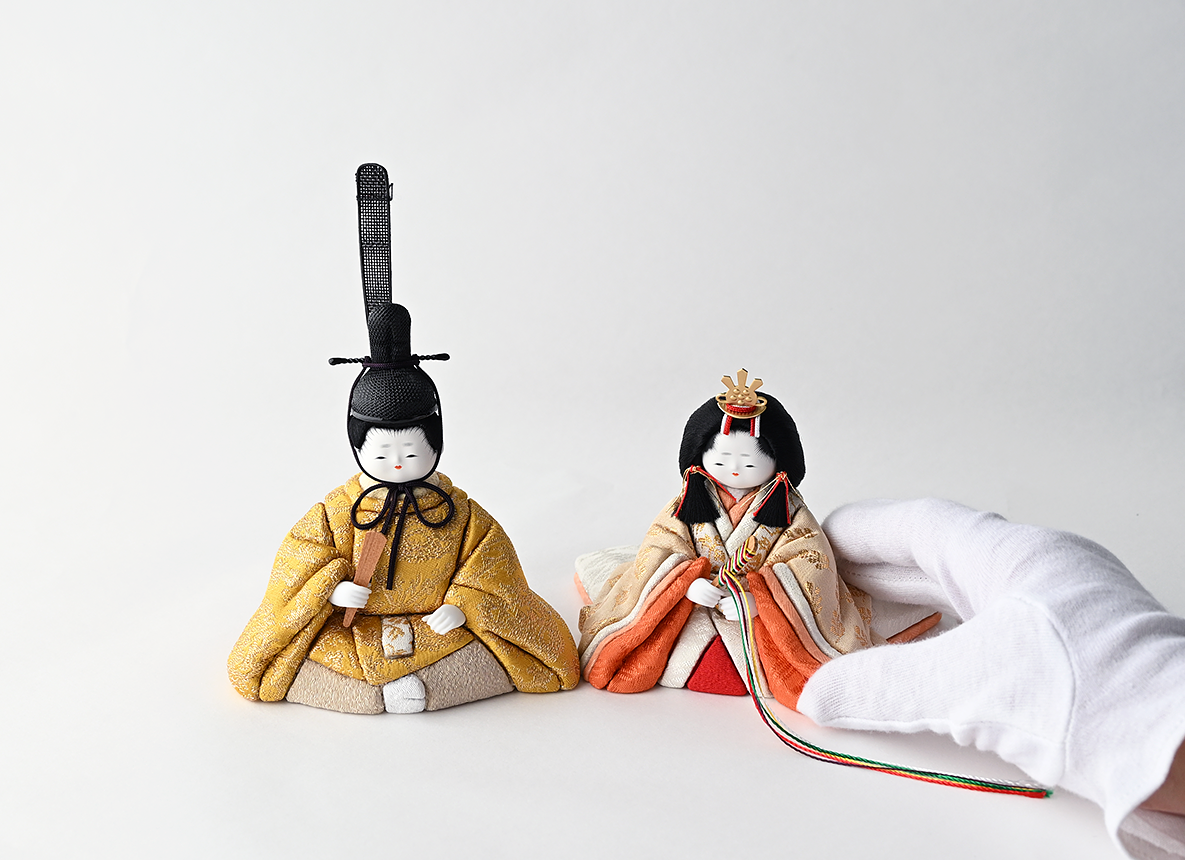 【龍村】 飾り台やお屏風が選べる、コンパクトで飾りやすいHINAシリーズの雛人形です。下ほほがふくらみを帯びたお顔だちは、いとけなくも純真無垢で麗しい赤ちゃんの一面と、成長の末、気品あふれる姿となるお子様の未来の姿が込められています。見ているこちらが思わずほほえんでしまうお顔は、五色・原孝洲特有の愛らしさです。お人形の命とも言える髪は、上質な絹糸を丁寧に結い上げ、ふっくらと空気をまとった姿に見応えがあります。上品なお顔だちに合わせ、お衣装も一段とこだわりました。お衣装には極上織物・龍村裂のお着物を着せつけました。遠き奈良〜平安時代にシルクロードから日本へ伝わった、ペルシャ風の草花模様をイメージさせる格調高い柄が、ツヤを含んだ上質な生地に浮かびあがります。体の造形は、お殿様の袂(たもと)のひだの表現、後背部には下襲の裾(したがさねのきょ)と呼ばれる部分まで再現しております。お姫さまもひだの表現や、後背部の裳袴(もばかま)と呼ばれる部分まで美しく作り込まれ、実際に着物を着重ねたようなお姿は、木目込み人形の水準の高さを示します。殿姫同様に、お子様の行く末頼もしい成長を見守る三人官女は、雛人形の華やかでいながら厳かな味わいを豊かにします。かわいいだけでは終わらない、伝えるべき大切な日本文化の美しさをこの場へ現出させてくれます。雛人形として欠かすことのできない三人官女も私たちのこだわりです。コンパクトな平らな飾り台に、すっきりとしたデザインの屏風をのせてお飾りする、上品でおしゃれな雛人形です。【蒔絵】 豪華な蒔絵のお衣装です。伝統的な美しい花浅葱色(殿)と茜色(姫)の上に、贅沢にも本金箔を使った蒔絵の技法(手描きで衣装の上から直接描く)で絵柄を施しました。草花図としての桜・橘・萩がお衣装の色彩と相まって鮮やかに浮かびます。細かな柄なので少量製作となりますが、その技の確かさから多くの方から人気の作品です。繊細美を極めた伝統的な味わいをお楽しみください。
