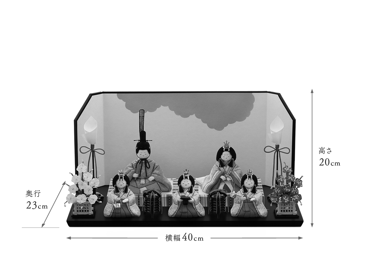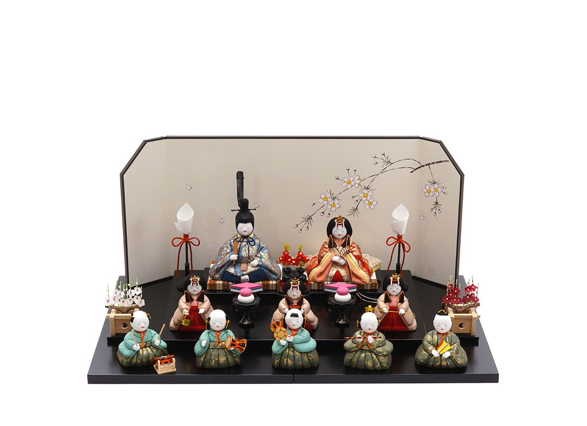 お人形やお道具などゆったりとお飾りいただける飾り台幅45cmの「竹」にご変更可能です。詳細はこちら⇒Topics「末広雛五人飾りの飾り台_竹につきまして」