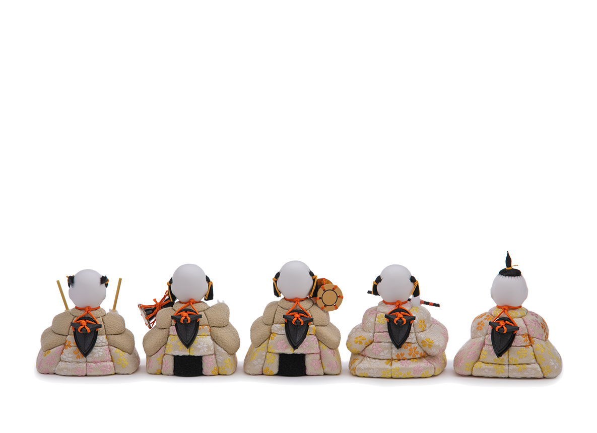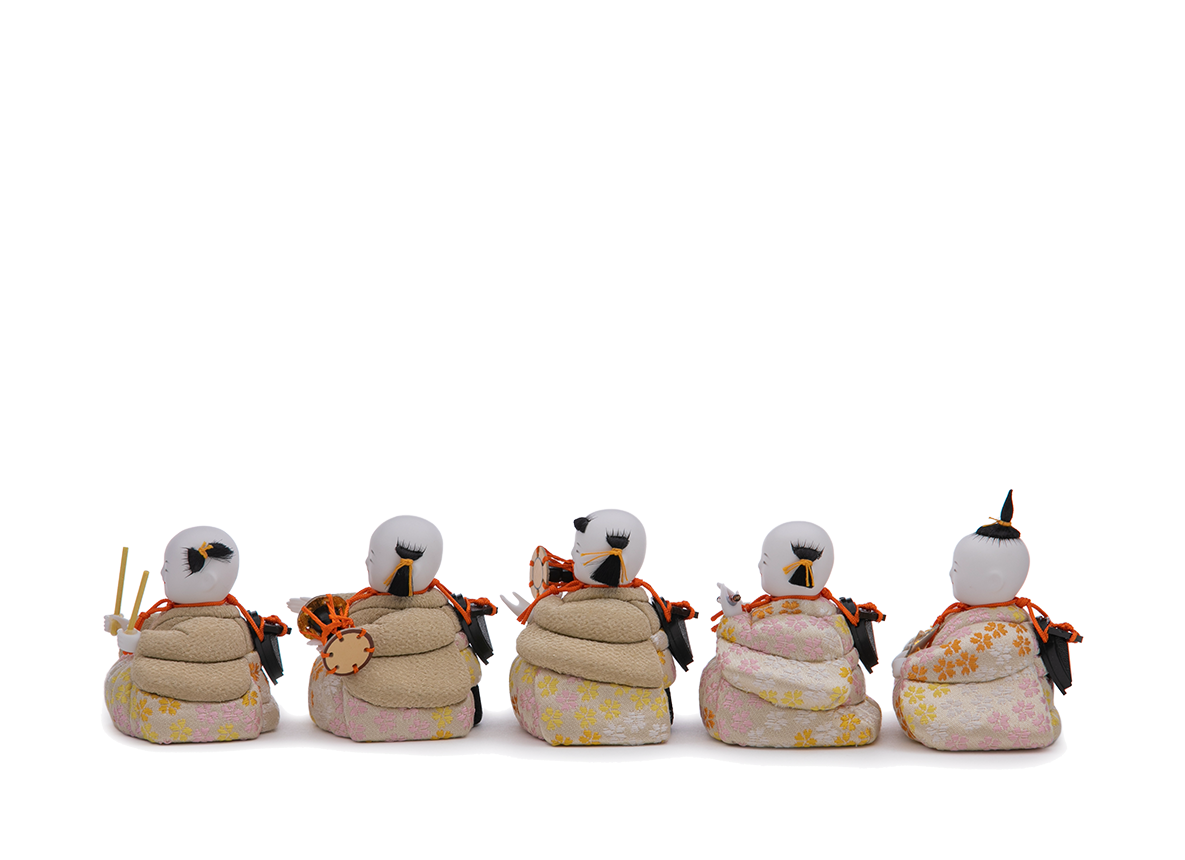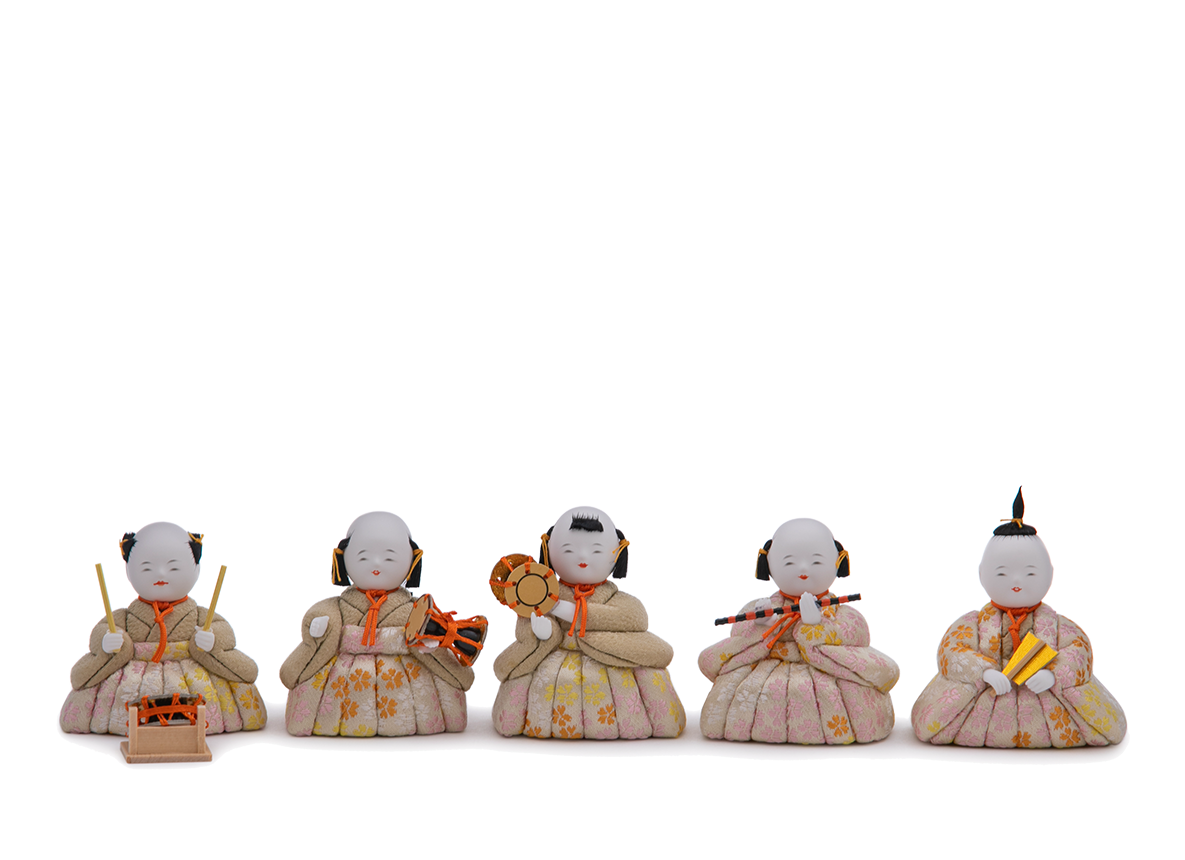 五人囃子に至るまで工夫を凝らし精緻なお作りを心がける、五色・原孝洲の特別なお人形さんです。まず目を惹くのはその髪型。その昔実際に幼児や子供の髪型とされた習俗を取り入れており、かわいらしいだけでない、文化を後世に伝えることができる本格のお人形づくりを心がけました。例えば、太鼓と大鼓、笛の子は「奴」(やっこ)と呼ばれる髪型。真ん中の小鼓の子は「唐子」(からこ)、右端の謡(うたい)の子は「芥子坊主」(けしぼうず)という特徴的な髪型です。ここまで髪型にこだわった五人囃子は他に例がありません。お殿さまとお姫さま、三人官女の五人飾りに追加する五人囃子として、全体の雰囲気をより華やかにすることでしょう。サイズ感としては、主にHINAシリーズ40〜45cm用の雛人形たちと合います。